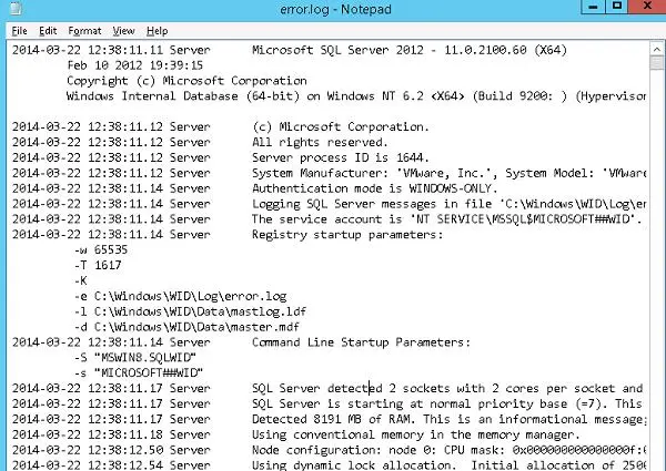 2014-03-22 12:38:11.14 Server Logging SQL Server messages in file 'C:\Windows\WID\Log\error.log'.