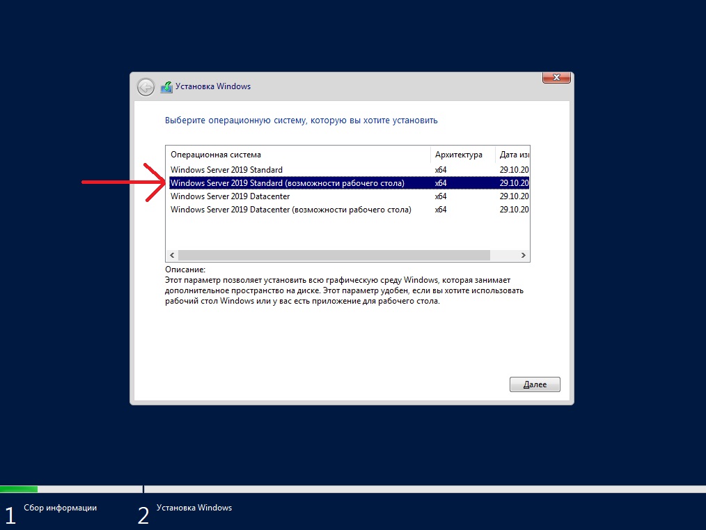 Далее выбираем желаемую редакцию Windows Server 2019 для установки. В данной статье мы установим версию Standard, но Вы можете выбрать другую версию, к примеру Datacenter. Порядок установки в ней аналогичный.