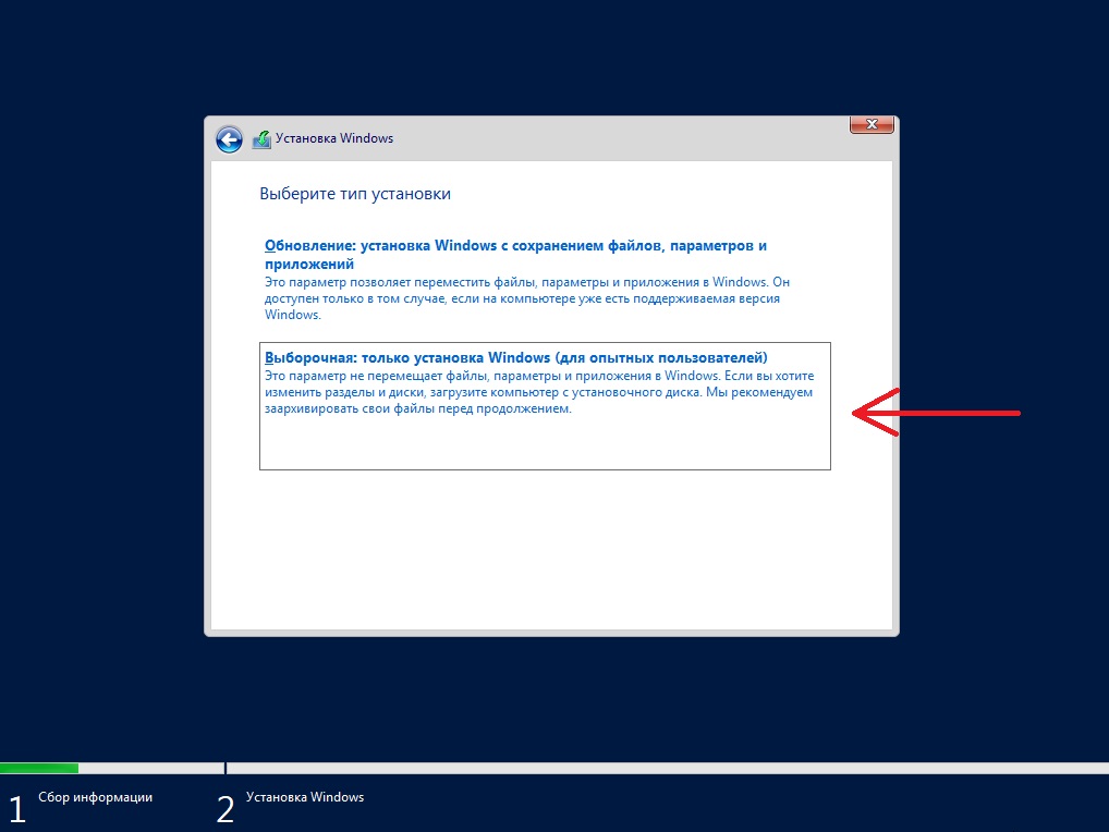 Далее, выбираем выборочную установку, т.к мы устанавливаем систему с нуля.