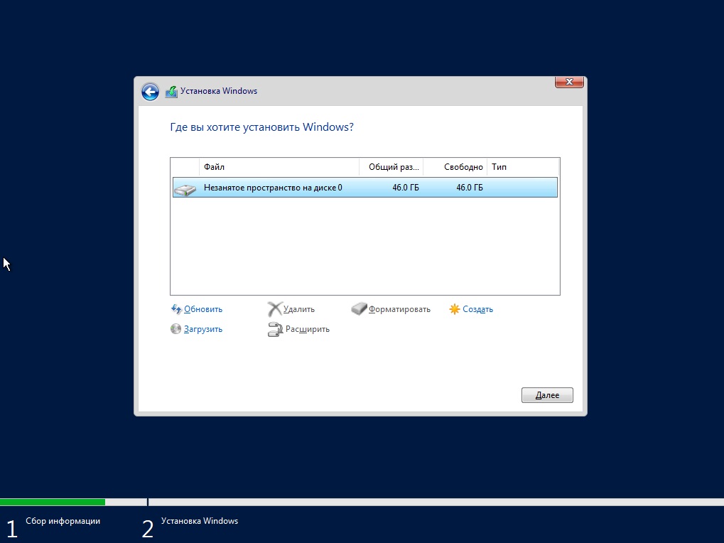 После у Вас будет меню выбора диска куда установить систему. На нашем примере только один диск, у Вас же их может быть больше. Выбираете нужный диск для установки и нажимаем “Далее”.