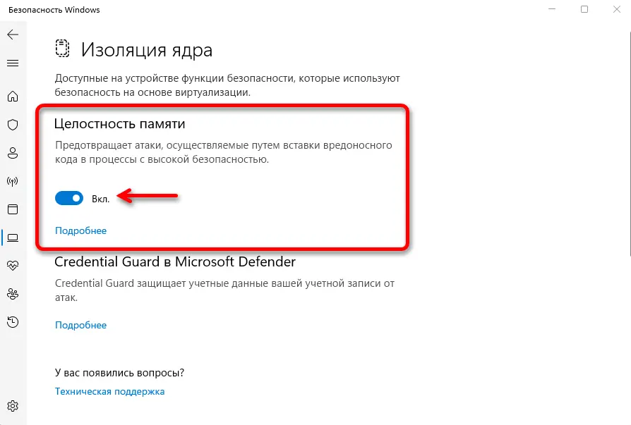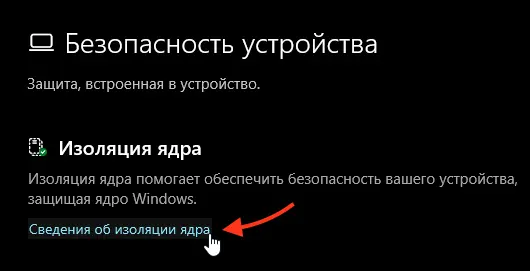 Если в разделе Целостность памяти указано “Включено”, значит, изоляция ядра активирована.