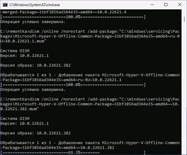 4. По завершении установки вам предложат выполнить перезагрузку в окне командной строки. Введите Y и нажмите Enter, дождитесь завершения перезагрузки и установки необходимых для работы Hyper-V компонентов.