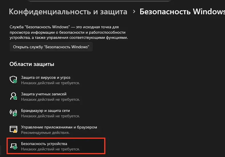 Выберите Безопасность Windows, затем Безопасность устройства.