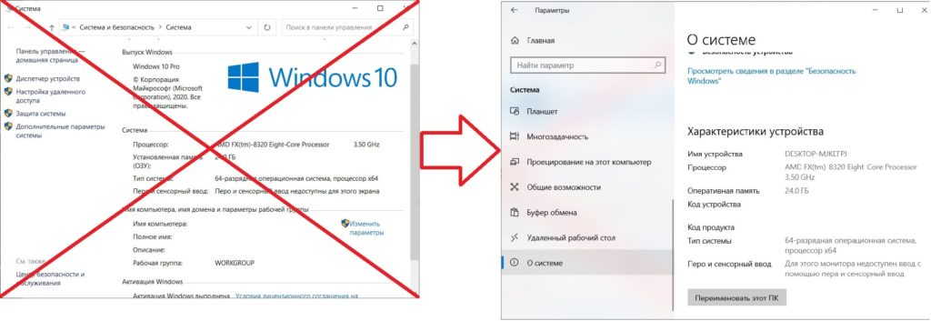 В новой версии 20H2 Microsoft окончательно удалила меню (апплет) “Свойства” системы. Если Вы попытаетесь открыть его, то Вы попадете в меню “О системе” в параметрах Windows. Вся информация и характеристика ПК, и самой системы доступна теперь в “Настройках”.