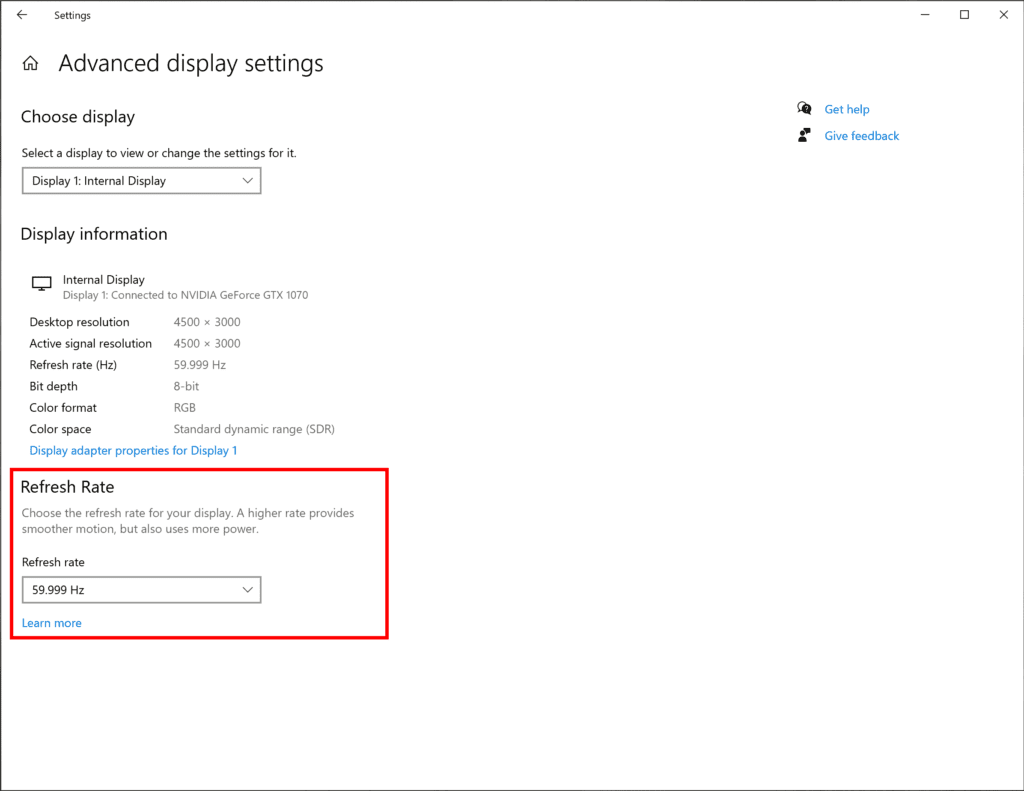 Теперь в меню “Параметры” Вы можете выбрать частоту обновления Вашего монитора. Параметры => Дисплей => Дополнительные параметры графики.
