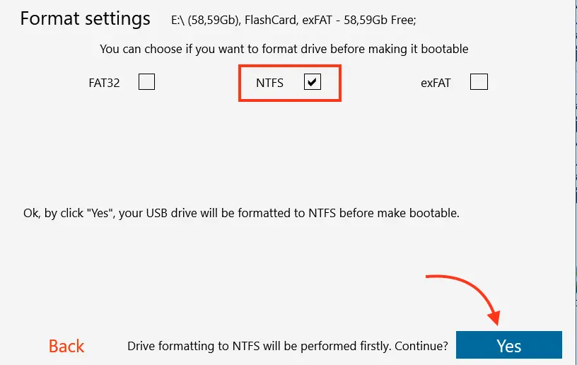 5. Выберите формат NTFS и нажмите Yes, чтобы продолжить.