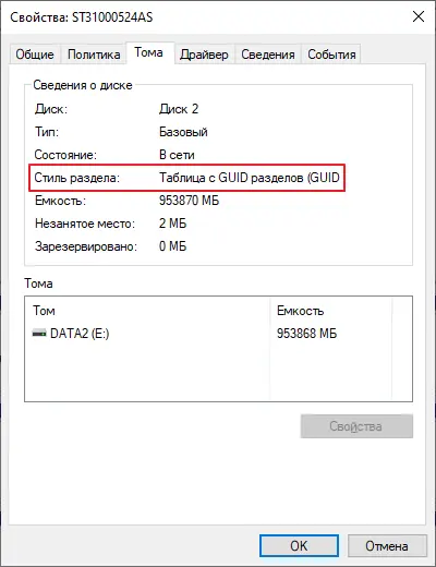 9. Проверьте в «Управление дисками» (diskmgmt.msc), что системный диск имеет тип «Таблица разделов GUID» (GPT).