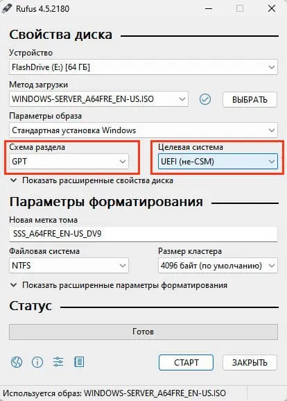 3. В Rufus укажите ISO, схему раздела (MBR или GPT) и файловую систему.
