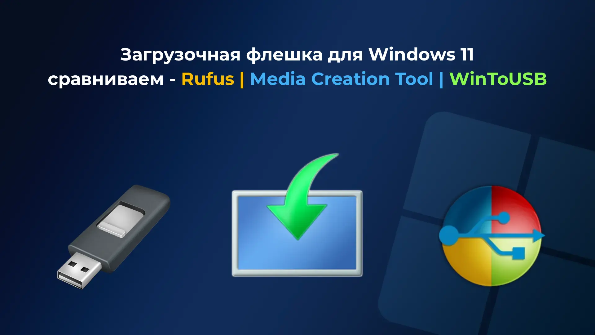 Загрузочная флешка — это незаменимый инструмент для установки или восстановления Windows. Её можно создать разными способами, и у каждого есть свои преимущества. В этой статье мы подробно разберём три популярных метода: Rufus, Media Creation Tool от Microsoft и WinToUSB. У нас уже есть отдельные статьи про каждую из этих программ, но здесь мы соберём всё воедино и сравним их возможности.