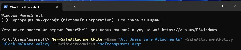 New-SafeAttachmentPolicy -Name "Block Malware Policy" -Enable $true -Action DynamicDelivery -Redirect $falseNew-SafeAttachmentRule -Name "All Users Safe Attachments" -SafeAttachmentPolicy "Block Malware Policy" -RecipientDomainIs "softcomputers.market"