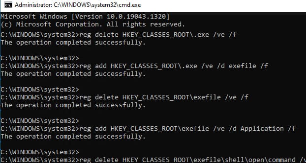reg add HKEY_CLASSES_ROOT\.exe /ve /d exefile /f
