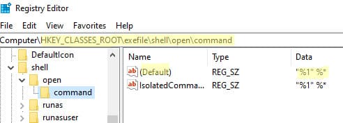 reg delete HKEY_CLASSES_ROOT\exefile\shell\open\command /ve /f