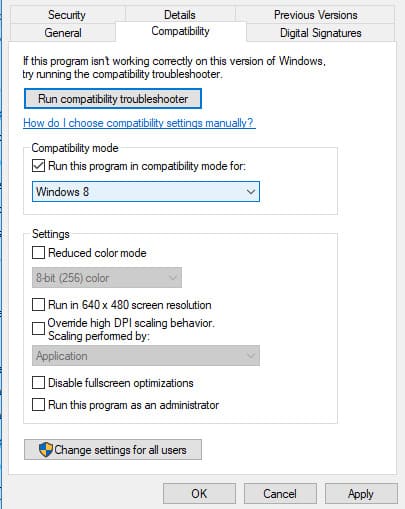 3. Run the file in compatibility mode: in the .exe file properties, select Compatibility and set compatibility mode with Windows 8.
