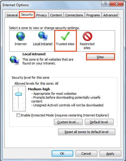 4) Now, go to Internet Explorer settings. Internet options => Security => Trusted sites => Sites.