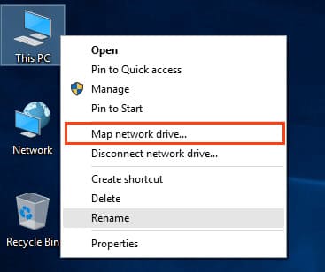 5) Now you can proceed to connect the network drive itself. From File Explorer, right-click on «This PC» => Map network drive.