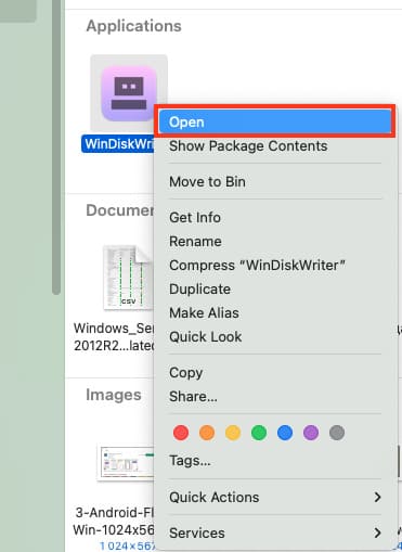 1) Open WinDiskWriter by right-clicking on it and click «Open» in the pop-up window.