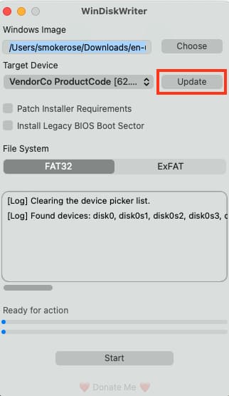 3) After this, insert the USB drive into your Mac and in the WinDiskWriter program click «Update» to display it as the destination device.