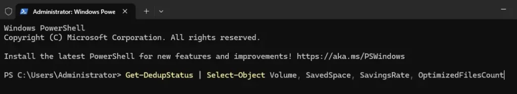 Get-DedupStatus | Select-Object Volume, SavedSpace, SavingsRate, OptimizedFilesCount