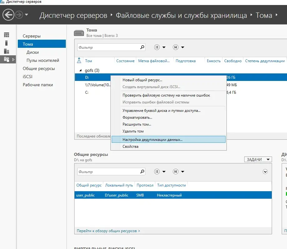 Для настройки откройте Диспетчер серверов -> Файловые службы -> Тома. Кликните правой кнопкой по нужному тому и выберите «Настройка дедупликации данных».