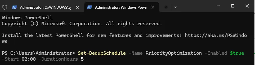 Set-DedupSchedule -Name PriorityOptimization -Enabled $true -Start 02:00 -DurationHours 5