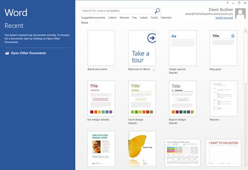2) The start page of Microsoft Office 2013. Now, when opening Office 2013, the user sees not an empty (new) document, as in Office 2010, but the Microsoft Office start page. It displays a list of recently opened documents, as well as numerous templates that you can start working with right away.