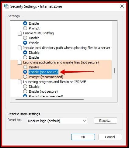 4. In the settings list, find «Launching programs and unsafe files» and check the option «Enable (not secure)».