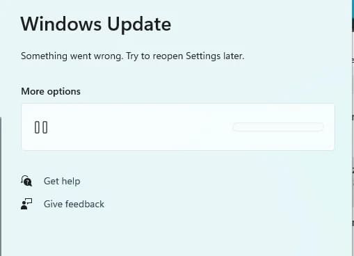 — In the opened Windows Update Center window, you’ll see the message: «Something went wrong. Try reopening settings later», indicating that you’ve successfully disabled Windows 11 updates.