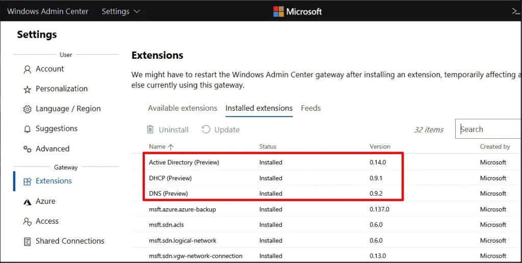 — После установки расширения перезагрузить службу шлюза Admin Center (ServerManagementGateway).