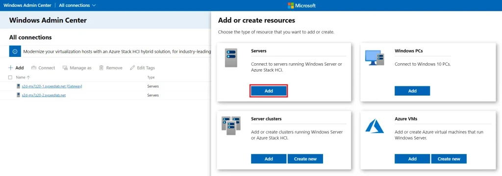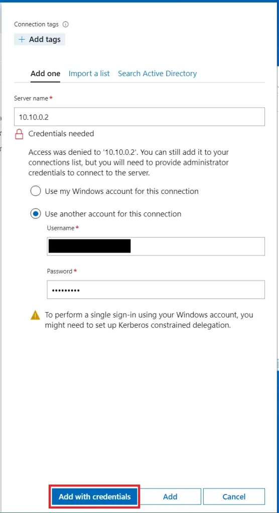 — В интерфейсе Admin Center добавить сервер (Add Server) — указать имя или IP, выбрать учётные данные.