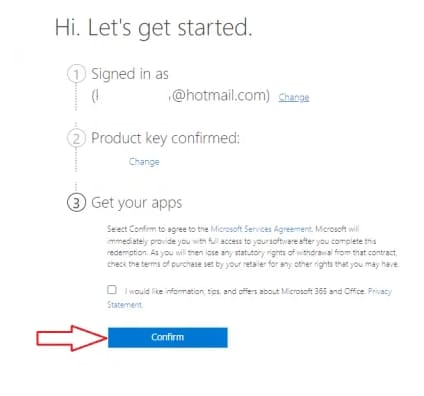 4) Теперь когда Ваш ключ подтвержден, поставьте галку о лицензионном соглашении и после нажимаете «Далее». (Не обращайте внимание, что у Вас может быть указано, что Вы получите приложение Microsoft 365, а ключ Вы ввели от другой версии Microsoft Office, это не имеет значения. Само приложение скачается нужной Вам версии, для которой и предназначался ключ активации).