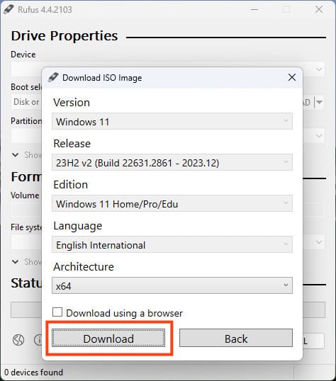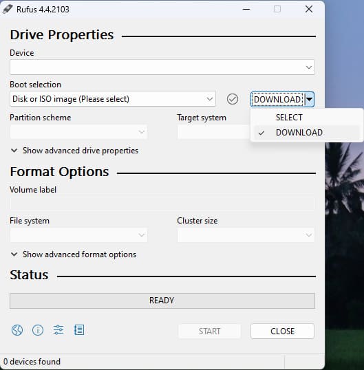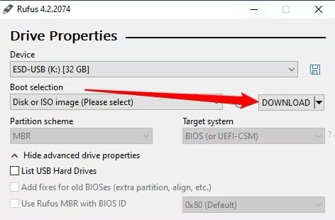 — Run Rufus utility, in the download method should be selected «Disk or ISO-image». Select «Download» from the drop-down menu on the right.