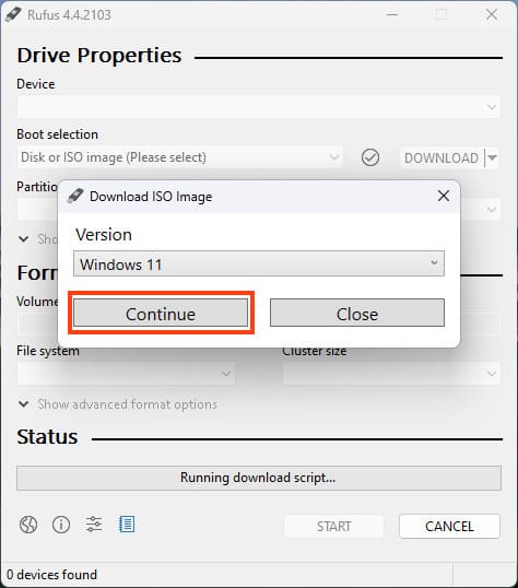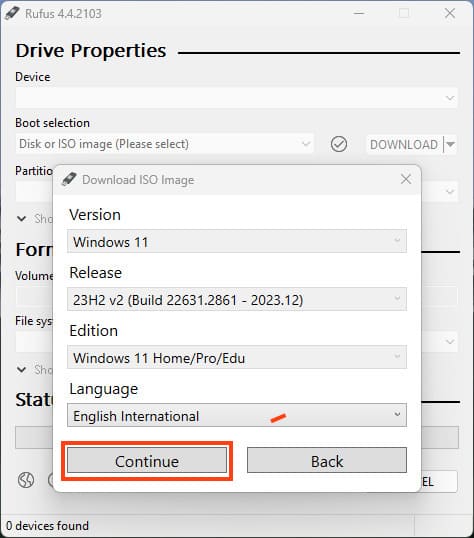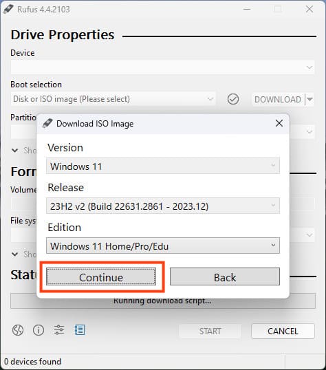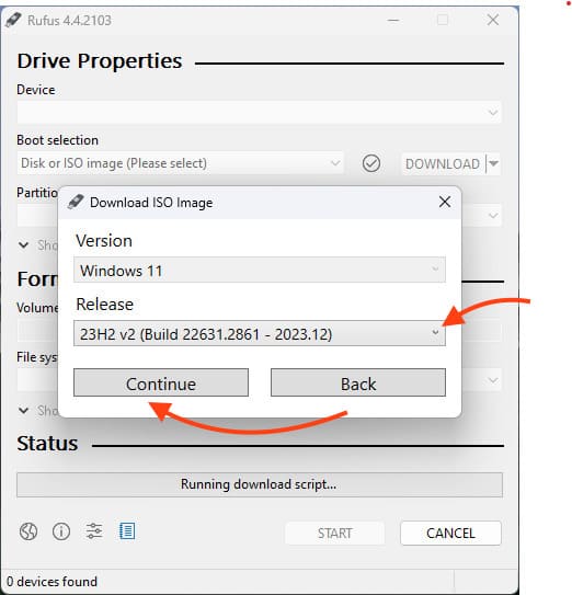 Select «Release» from the drop-down menu. At the time of writing, 23H2 v2 is available; you may have a newer version. Then click «Continue» as well.