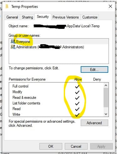 Right-click on the Temp folder, open «Properties» => «Security» and add full permissions for your local user.