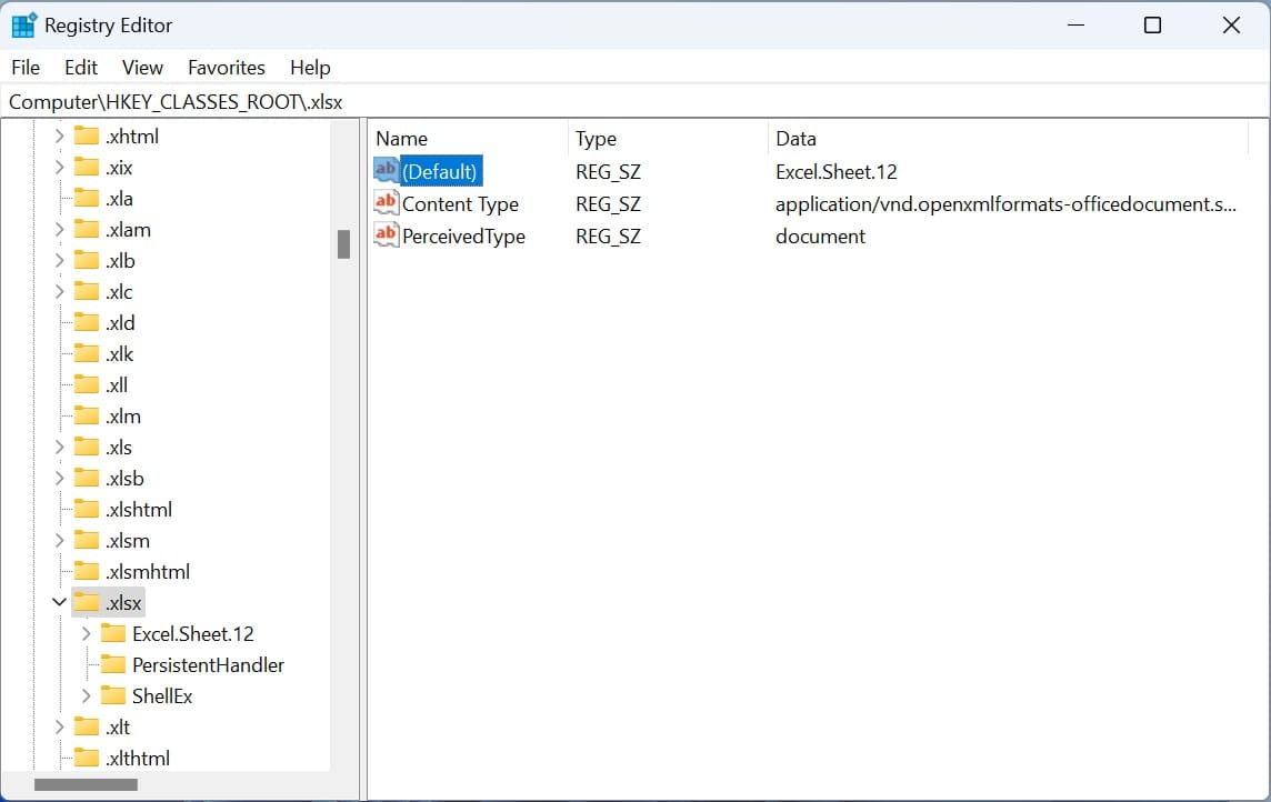 2) Find the HKEY_CLASSES_ROOT\.xlsx branch in the registry => And change the default value of the file to Excel.Sheet.12 => Click «OK».