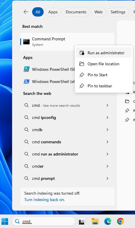 1. Enter «cmd» in the search and open the command prompt as an administrator.