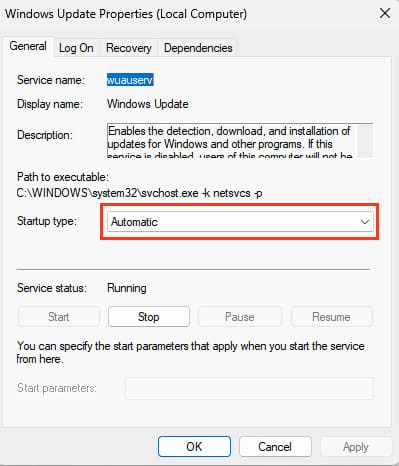 3. If the service is stopped, right-click on its name, select «Properties,» set the startup type to «Automatic» on the «General» tab, then click «Start» and «OK.»