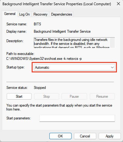 Option 8. Ensure that the BITS service is running and operational