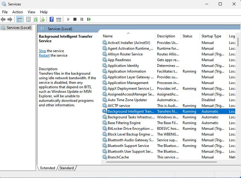 2. Find the «Background Intelligent Transfer Service» and make sure that its status is «Running.»