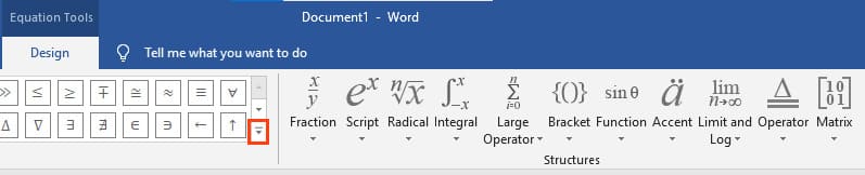 1. In the Equation Tools area on the Design tab in the Symbols group, click the More arrow