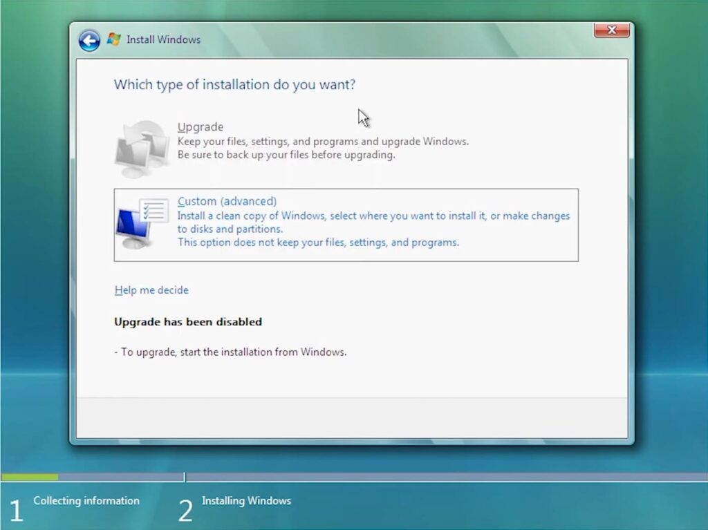 — Choose «Custom (advanced)» as we are doing a clean install.