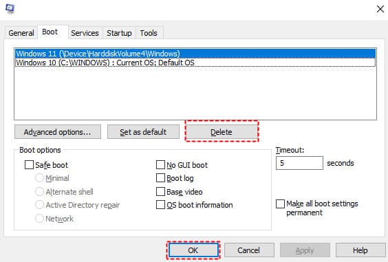 4) Then select the system you want to remove and click on the «Delete» button.