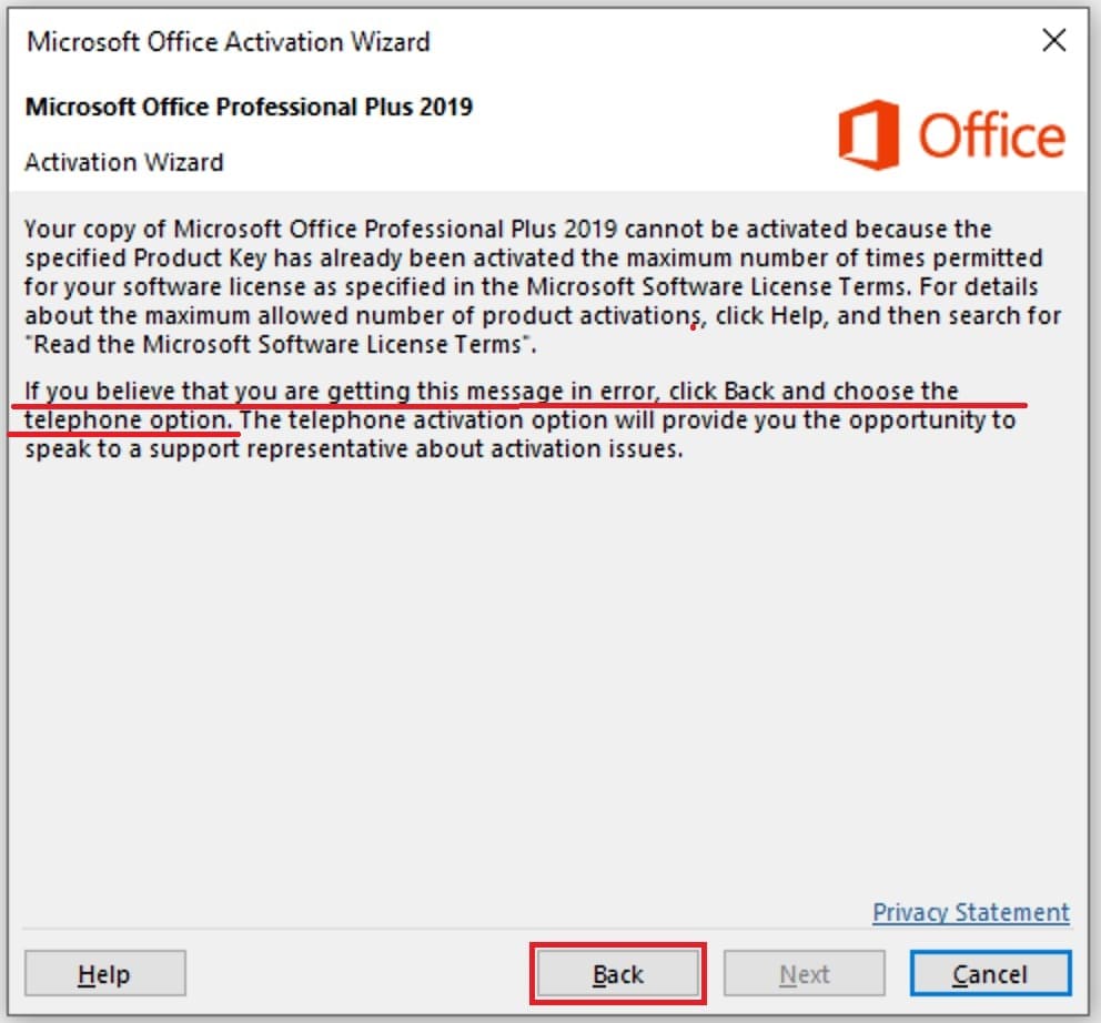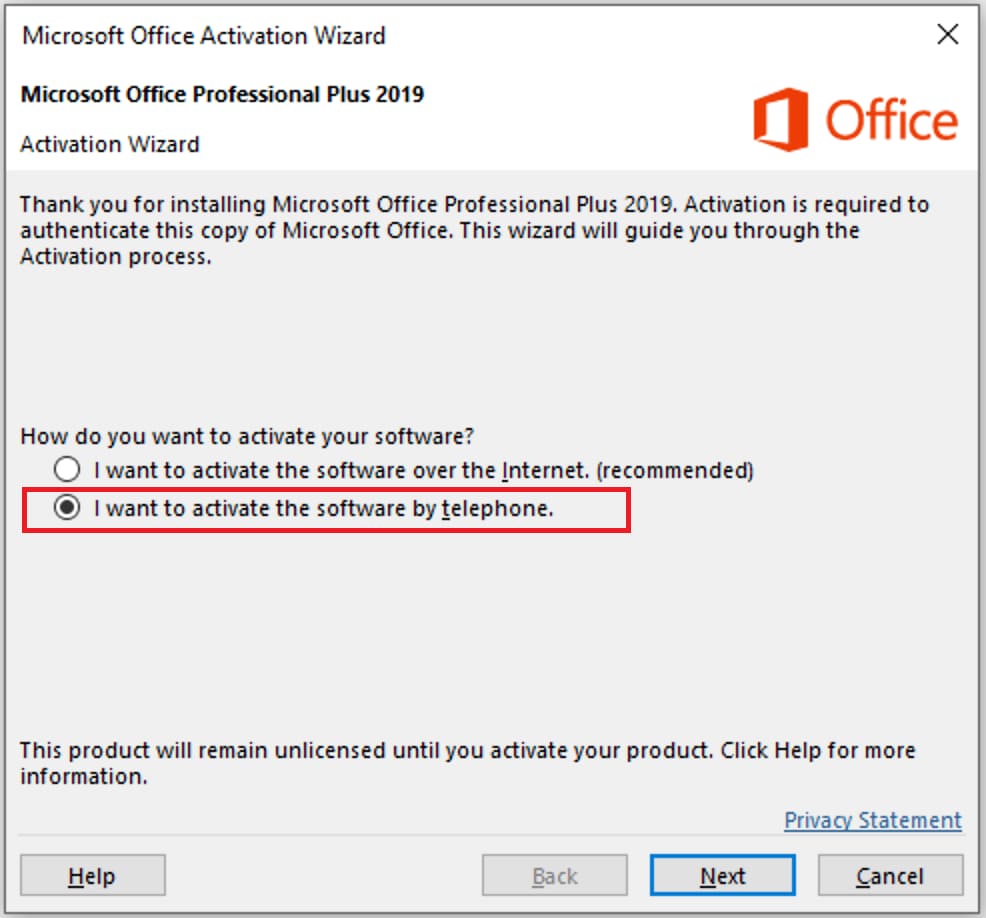 You can also use our technical support. Send us a screenshot of the activation window by phone, we will send you a response confirmation ID. Support only works if you purchased the Microsoft Office 2019 product key in our store.