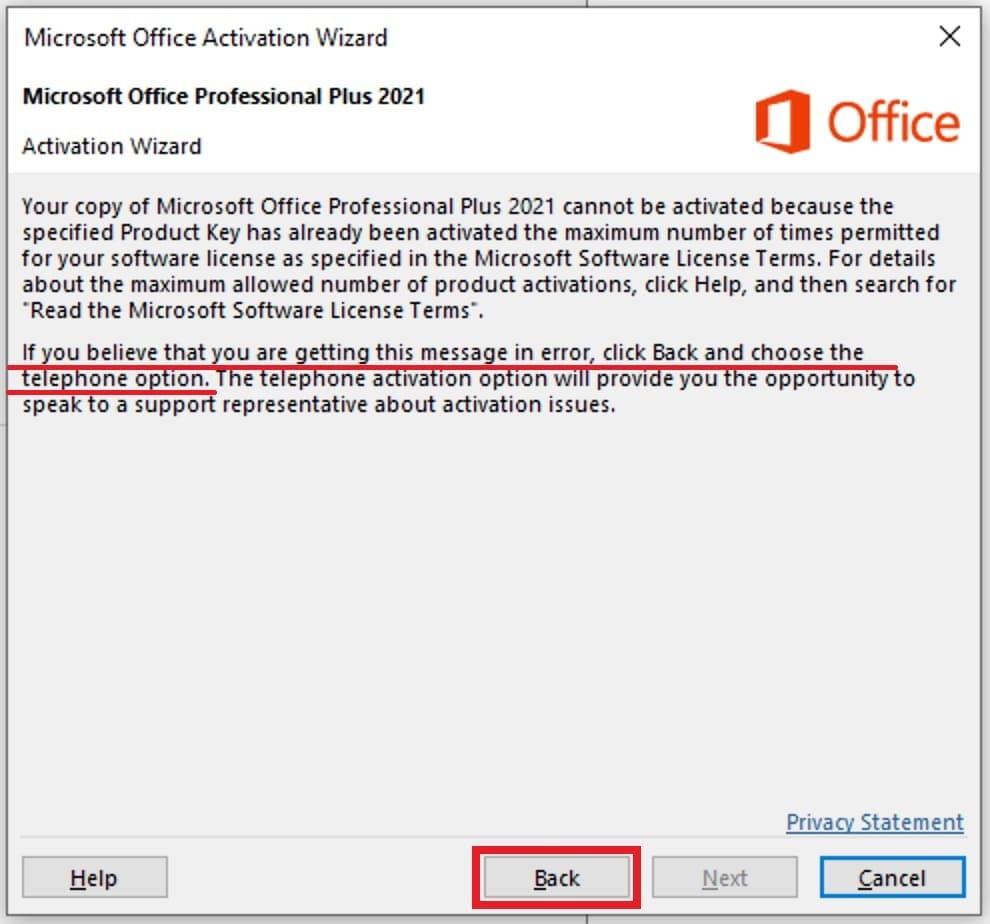 In this article, we will consider a situation when, when activating Microsoft Office 2021 online, an activation error appears as in the screenshot below, in this case, according to the advice from the second paragraph from the description of this error, you need to activate the application by phone. Activation is carried out using a robot answering machine, you will need to type numbers on the keyboard of your phone. After seeing this error, click «Back» and select the activation item by phone.