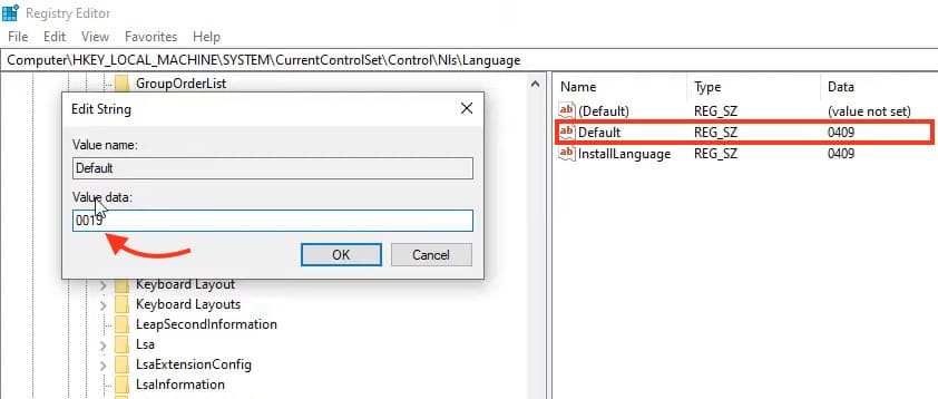 — In this menu, we’re interested in the values of Default and InstallLanguage. In our example, the values are set to 0419, which corresponds to the English language.