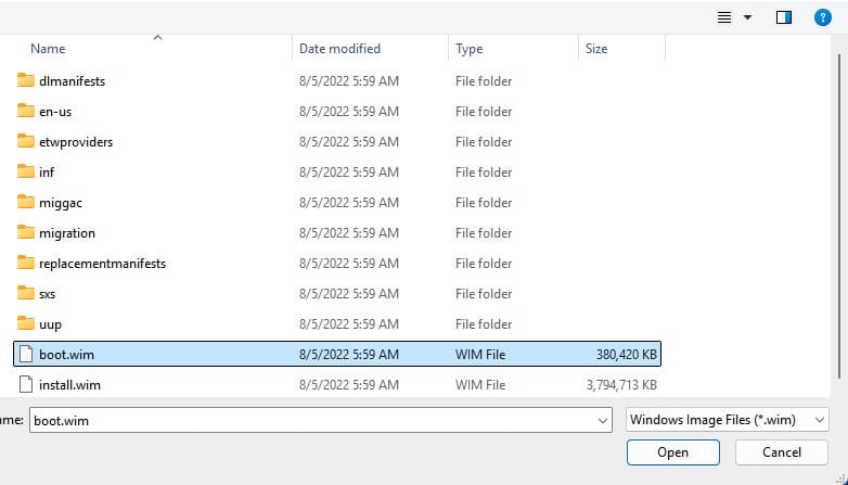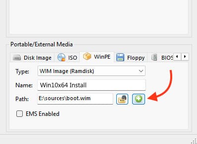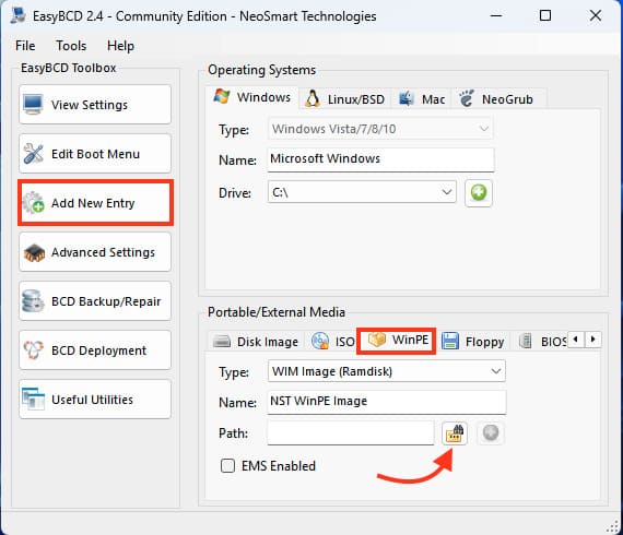 — Open EasyBCD, select the Add New Entry tab, then select WinPE and specify the path to the boot.wim file in the sources folder.