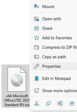 3. Verify the file: As an example, we will check the Windows installer image. Find the image file on your computer (any file, installer, etc.), right-click on it, and select «Properties.» In File Explorer, an additional option for calculating file checksums should appear. Click on it, and the calculation process will begin.