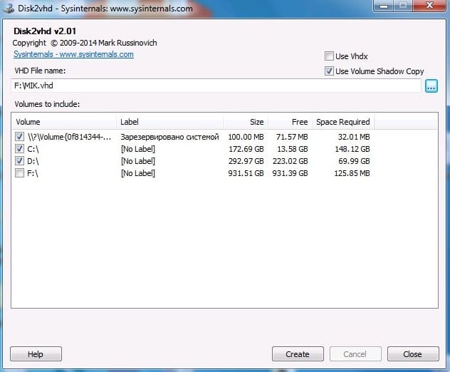3. In the Disk2vhd application window, in the «VHD File name» field, choose where to save the virtual hard disk. Below, check the boxes for the partitions you need to save.