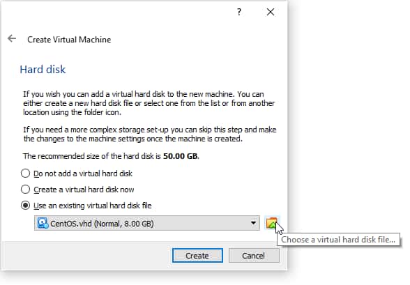 3. During the hard disk selection step, instead of choosing «Create a new virtual hard disk», select «Use an existing virtual hard disk» and specify the previously created VHD file.