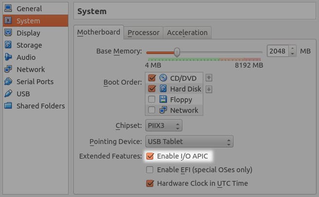 2. In the «Motherboard» tab, enable or disable the «Enable I/O APIC» option and try to boot the system again.