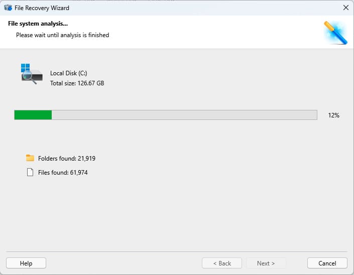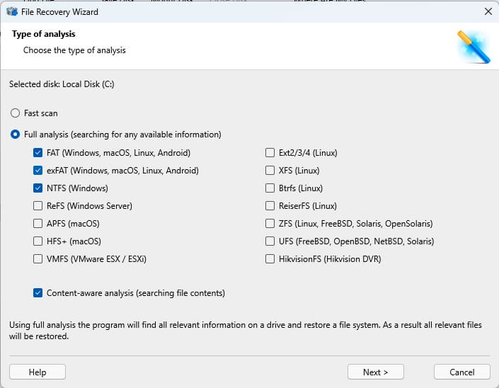 3. If the basic analysis did not find the required data, run a full analysis of the media. This will allow the application to detect all files that can be recovered.